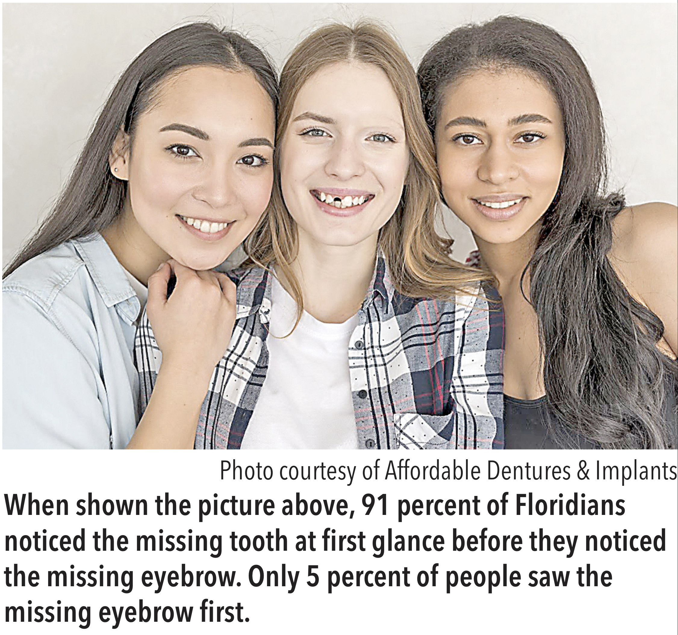 When shown the picture accompanying this article, 91 percent of people in Florida noticed the missing tooth at first glance before they noticed the missing eyebrow. Only 5 percent of people saw the missing eyebrow first.