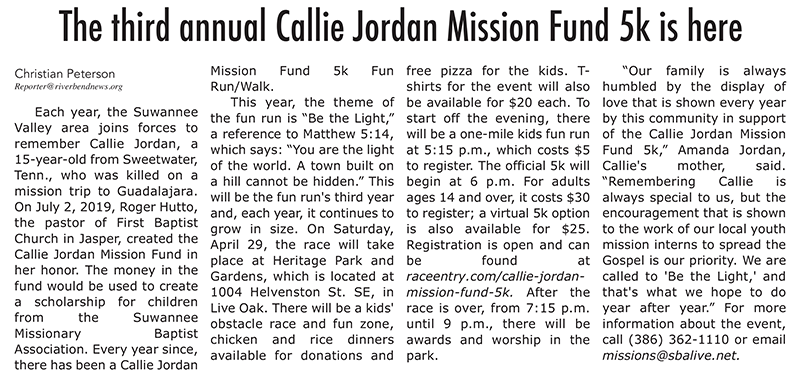 The third annual Callie Jordan Mission Fund 5k is here Posted on April 28, 2023 Read the full story in our latest edition of the Riverbend News! Share this: Share on Facebook (Opens in new window) Facebook Share on X (Opens in new window) X Related