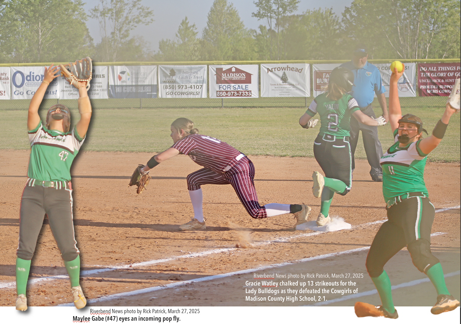 On Thursday, March 27, the Suwannee High School Bulldogs traveled to Madison for a softball contest with the Madison County High School Cowgirls. It was a closely contested defensive game in which hits were few and far between for both teams, thanks to strong pitching performances from both opposing pitchers. After two scoreless innings, the Bulldogs were the first to put runs on the scoreboard, taking a 2-0 lead in the top of the third inning. The Suwannee girls were able to keep the Cowgirls at bay, despite giving up one run in the bottom of the sixth inning. The Bulldogs returned to Live Oak with a 2-1 win over the Cowgirls.