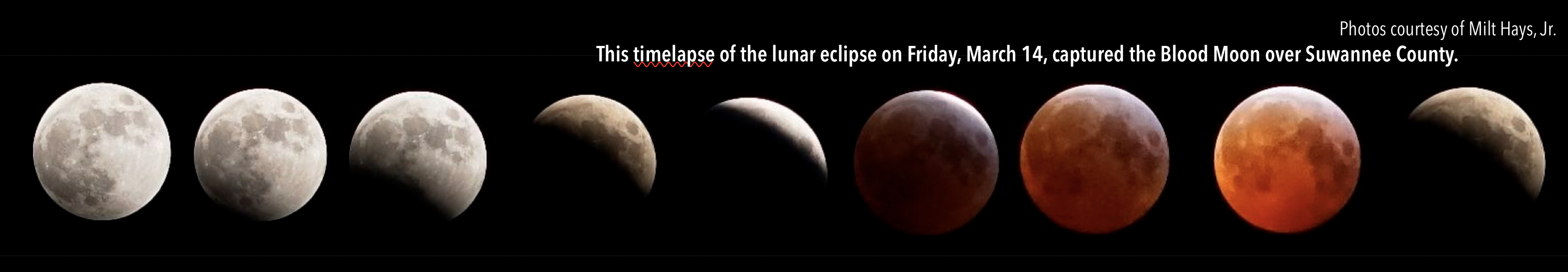 The Riverbend News would like to extend a special thank you to reader Milt Hays, Jr., who read our March story about celestial events and took some excellent photographs of the lunar eclipse and sent them in to us. If anyone is able to capture a clear image of one of the April celestial events, you may submit photos for possible publication with our upcoming May article.
