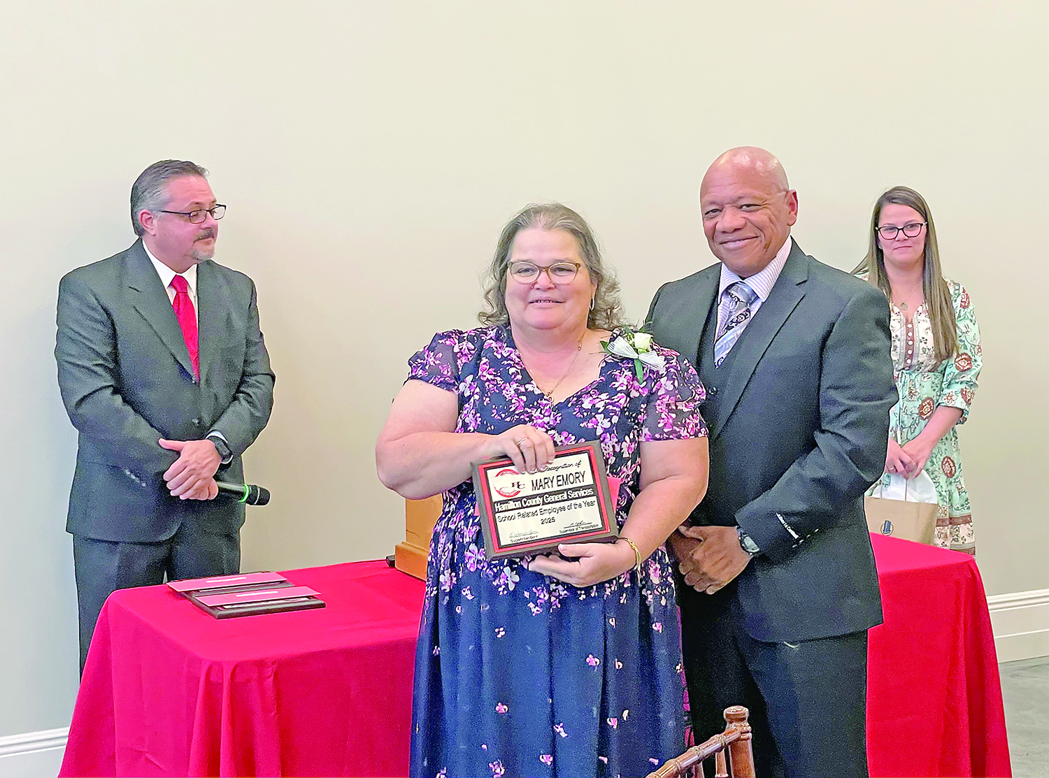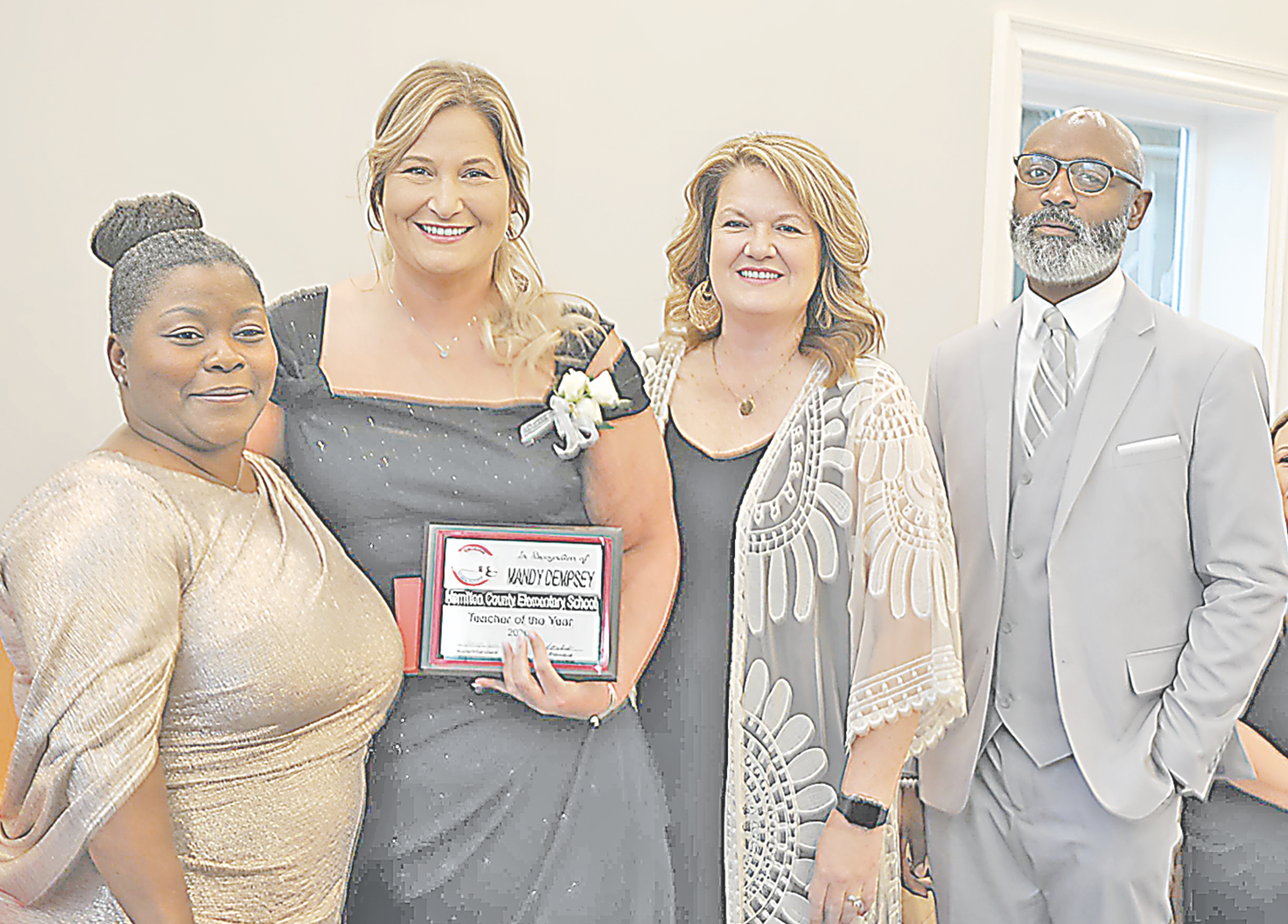 The first award presented was the Hamilton County Elementary School (HCES) SREOY, which was awarded to Sonya Gandy. Principle Kathy Griffin and Assistant Principals Charles McCoy and Erica McCoy presented the award. “She is the backbone of the school,” Griffin said of Gandy. “She is always there to support teachers, staff, students and our concessions. We would not be able to do any of this without Ms. Gandy.”