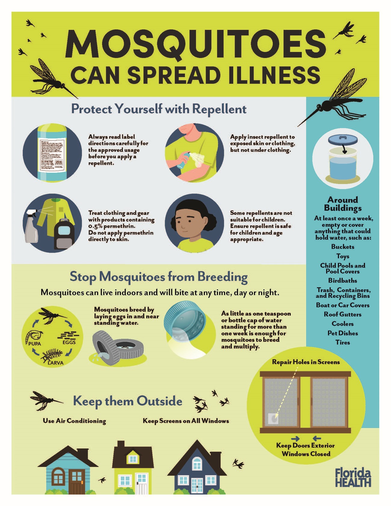 Another aspect is to prevent mosquitoes from breeding. They can live indoors and will bite at any time, day or night. Mosquitoes tend to lay eggs in and around standing water. In fact, as little as one teaspoon or a bottle cap of water left for one week is long enough for mosquitoes to breed and multiply. Good advice is to make weekly checks around your residence and empty or cover anything that can hold water, such as buckets, toys, child pools, pool covers, birdbaths, trash containers, recycling bins, car covers, coolers, pet dishes and even tires. As a final reminder to prevent mosquitoes invading your house: use air conditioning and keep screens on all your windows.
