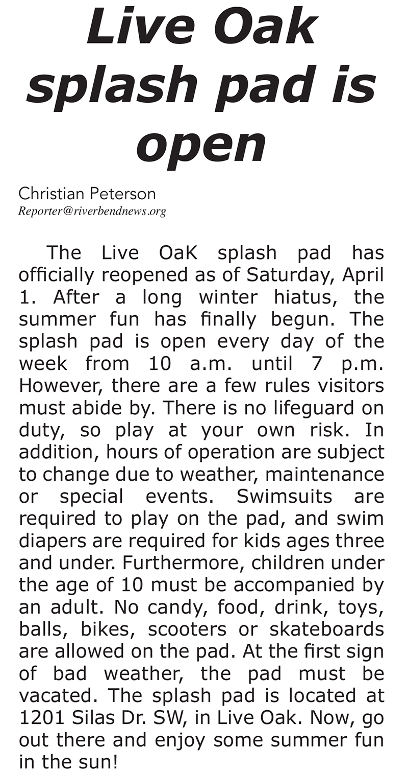 Live Oak Splash pad is open! Posted on April 26, 2023 Share this: Share on Facebook (Opens in new window) Facebook Share on X (Opens in new window) X Related