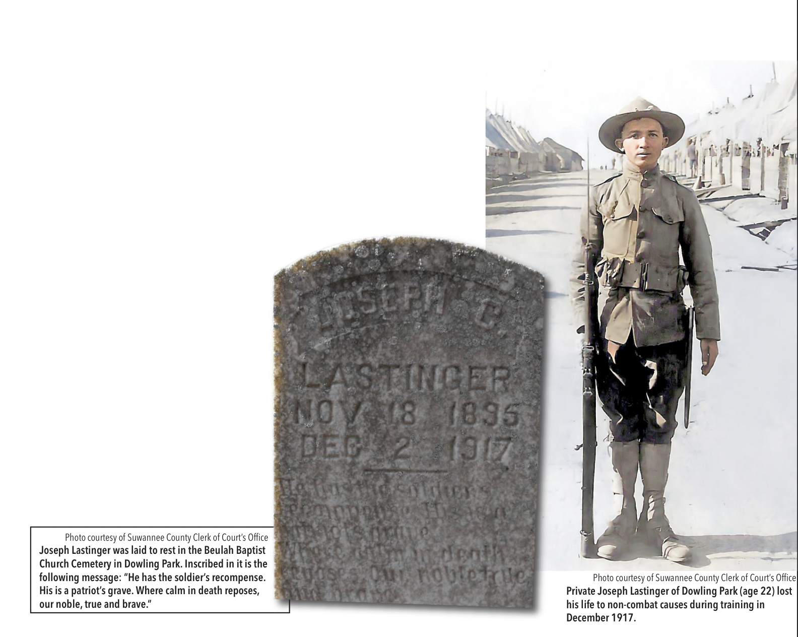 “These were: W. H. Lyle, captain; Yandall Brown, 1st Lieutenant; Harry A. Grant, 2nd Lieutenant; W. A. Hughes, 3rd Lieutenant; and there being no further business the meeting adjourned.” By December of 1917 the First Florida Infantry had been broken up and distributed to other units. Suwannee County also lost its first soldiers to non-combat causes the same month while in training: Private Joseph Lastinger of Dowling Park (age 22) and Silas Harrell (listed as “Harrold” in the newspaper; age 24) of Wellborn died at Camp Wheeler, the latter from pneumonia, as was reported in a local newspaper article that month.